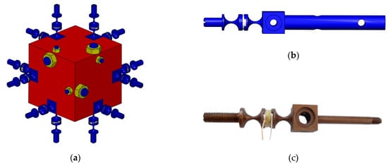The digital and physical prototype of the six-axis accelerometer is shown in Figure 1a,b, respectively. In order to display the assembly model of the six-axis accelerometer and the distribution of internal branches more intuitively, the exploded 3-D drawing is shown in Figure 2. The six-axis accelerometer is composed of a cube-shaped inertia mass, a cube-shaped pedestal, a sub-pedestal, a locking plate, a pretension rod, and twelve SPS (S—prismatic; P—prismatic pair) branch chains connecting the inertia mass and the pedestal. The configuration relationship between the branch chain combinations is shown in Figure 3a. The structure model and physical prototype of a single SPS branch chain are shown in Figure 3b,c, respectively. Each SPS branch chain consists of two flexible spherical joints [22,42] and a piezoelectric ceramic in series. The piezoelectric ceramics are cylindrical, both ends of which are connected with flexible spherical joints by epoxy resin adhesive.