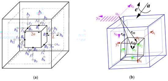Figure 4a shows the principle model of the accelerometer, which is a 12-6 Stewart derivative parallel mechanism. The pedestal, inertial mass, and piezoelectric ceramics can be regarded as a base, a moving platform, and sliding pairs in the parallel mechanism, respectively. bi (i = 1, 2, …, 12) and Bj (j = 1, 2, …, 6) are the spherical joints fixed on the pedestal and the inertia mass, respectively. fi (i = 1, 2, …, 12) are the forces along the axis of the branch chains. 2n denotes the edge-length of the inertia mass, and L denotes the initial length of the 12 branches.