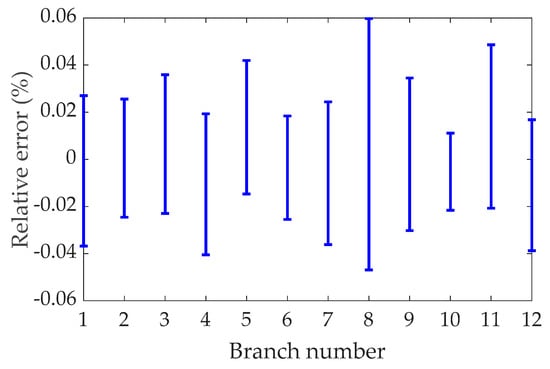 As a numerical example, the mass and side length of the inertial mass are set to 0.5 kg and 42 mm, respectively, and the initial length and stiffness of the branch chain are set to 24 mm and 2.07 × 105 N/mm respectively. A set of accelerations of any given base, in which the linear acceleration and angular acceleration have a frequency of 5 Hz, and the amplitudes are 1.97 × 104 mm/s2 and 5.17 × 102 rad/s2, respectively. The difference between the calculated results of FDEs and ADAMS software simulation results was compared within 3 s. The range of relative errors of the axial forces of the 12 branches is shown in Figure 6, respectively, which verifies that the FDEs presented in this article is correct. Figure 6 shows that the relative error is less than 0.06%, indicating that the calculated values of FDEs are completely consistent with the theoretical values. It is worth noting that, in order to obtain the above-mentioned axial force of the branch, the time used for the calculation process of the FDEs and ADAMS simulation are 0.09 s and 24.17 s, respectively. Among them, the calculation time of the FDEs is obtained according to the ‘tic-toc’ command in the MATLAB software, and the simulation time of ADAMS is determined according to the time consumed by the ADAMS software simulation process recorded by the computer. For the above cases study, we use an Intel CORE I7-8750H @ 2.20 GHz CPU and a 8 GB RAM and MATLAB R2018a.