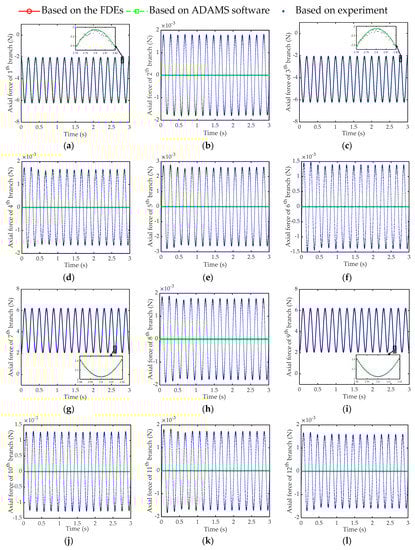 Furthermore, according to the parameter settings in Table 2 and the above-mentioned test conditions, the parameters are substituted into the FDEs of this article, and a virtual prototype with the same parameters is established in the ADAMS software. Taking the sampling frequency of 1000 Hz in Table 4 as an example, the results of the axial force of the 12 branch chains obtained based on three methods (FDEs of the sensor, simulation of ADAMS software, and the experimental measurement) are shown in Figure 10. Among them, the curve of the calculation result of the FDEs almost coincides with the curve of the simulation result of the ADAMS software.