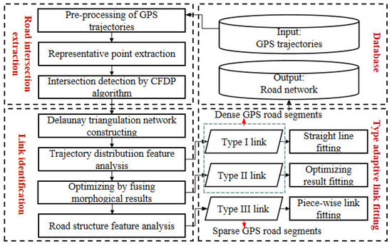 Due to the road characteristics of old downtown areas, in order to ensure that the road extraction results near intersections are not distorted, we adopt an intersection-link scheme to infer the road network of old downtown areas based on the analysis above. Unlike other approaches of calculating links directly after intersection detection, our method first identifies links and then creates road segments, which can make road extraction faster and more precise. The corresponding road information extraction scheme for old downtown areas, including three key parts, as shown in Figure 3, are: