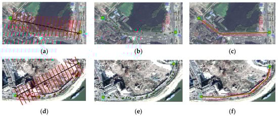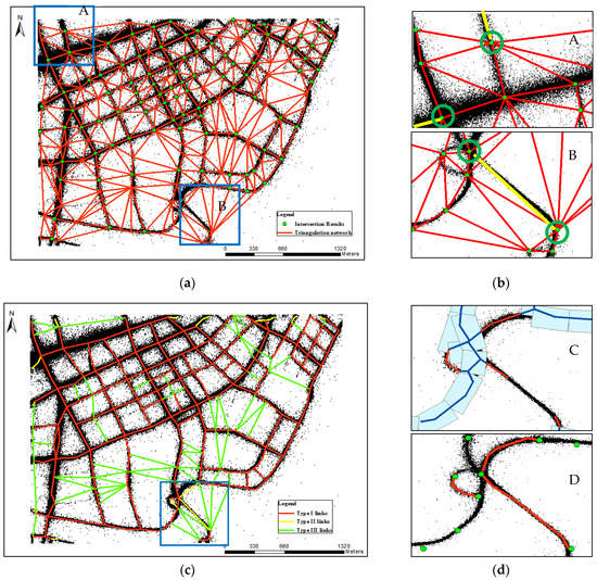 - Type I links fitting: the straight-line type I link identified by Criteria 1, 2, and 3, which coincides with road segments, can directly represent the centerlines of these road segments, as shown in Figure 5c.