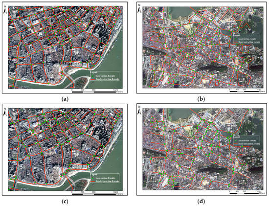 Road network and intersection extraction results. (a) Results of our method for Wuhan dataset 1; (b) results of our method for Wuhan dataset 2; (c) results of Davies’ method for Wuhan dataset 1; (d) results of Davies’ method for Wuhan dataset 2; (e) results of Ahmed’s method for Wuhan dataset 1; (f) results of Ahmed’s method for Wuhan dataset 2; (g) results of Karagiorgou’s method for Wuhan dataset1; (h) results of Karagiorgou’s method for Wuhan dataset 1.
