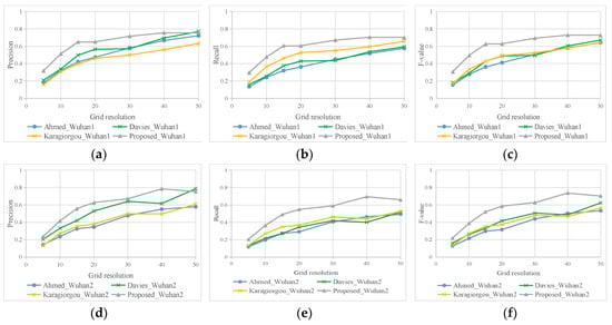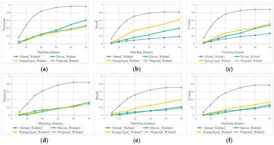 Quantitative comparisons of intersection extraction. (a–c) Wuhan dataset 1; (d–f) Wuhan dataset 2.