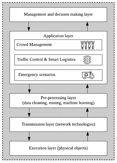 In general, SC management platforms focus on one or several of the following dimensions: Crowd Management, Traffic Control and Smart Logistics, or resource prioritization in emergency scenarios, etc. These modules interact and exchange information among them. Figure 2 illustrates an architecture that is typical of these platforms, which normally work independently and/or in collaboration with other existing platforms and IoT systems.
