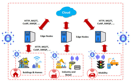 Figure 3 shows a basic schema of an edge computing architecture with edge nodes that allow user application processes to be executed closer to the data sources [35]. The edge nodes perform computing tasks such as filtering, processing, caching, load balancing, requesting services and information, and reducing the amount of data that are sent or received from the cloud.