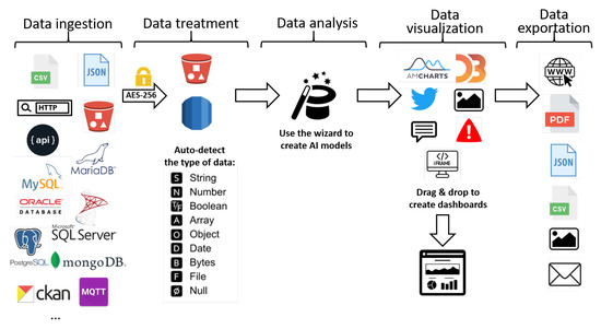 The platform aids the data analysis process at different levels: (i) it gives computer support so that cities do not have to invest in infrastructure; (ii) it offers mechanisms for the ingestion of data from different sources (relational and non-relational databases, files, repositories based on CKAN, streaming data, multi-functional IoT sensors, social networks, etc.) and in different formats; (iii) it offers data processing mechanisms to all users who do not have knowledge of programming (information fusion, data filtering, etc.); (iv) it offers information representation techniques based on interactive graphics to help understand data, the results of analysis and rapid decision making; (v) it helps select the methodologies that can be applied to the data provided by the user and automatically searches for the configuration that provides the best results (through cross-validation), so that the user does not have to configure anything at all. The data management flow can be found in Figure 1.
