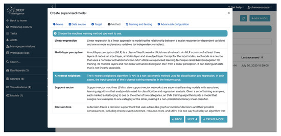 The platform provides tools for knowledge extraction within the context of various learning methodologies, as shown in Figure 7. We can find in it multiple supervised learning methodologies, both for classification and regression problems, using algorithms such as Decision Tree, Random Forest, Gradient Boosting, Extreme Gradient Boosting, Naive Bayes, Support Vector Machines, and linear and logistic regressions. In all of the cases, the configuration of the algorithms can be adjusted to achieve better performance. Additionally, there are unsupervised learning techniques available, including clustering methods (k-means, DBSCAN, and others), as well as association rule learning or dimensionality reduction techniques, for example PCA.