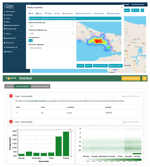 Deepint.net offers mechanisms for the management of all the information provided by the user, enabling the creation of different projects. Figure 12 shows a screenshot of the process of creating a model for data visualization, which as you can see, is extremely simple, since it consists of selecting the type of model to display the data, the data set and the selected parameters. Figure 13 gives a screenshot of the dashboards created for the visualization of city information, Panama (top) and Istanbul (bottom). Similarly, the creation of users and permissions is allowed so that all the group members/employees can exploit the results of the analysis, displaying them on dynamic and interactive dashboards. Deepint.net is a versatile, multipurpose platform, whose utility for smart territory or city management is of special interest.
