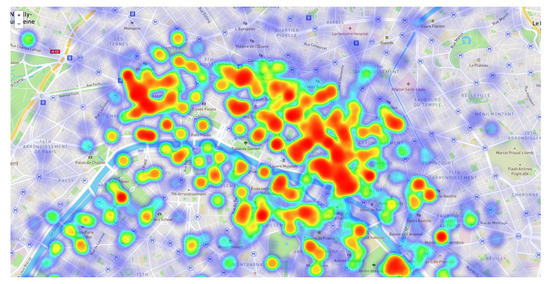 The heat map of a probability model for the availability of bikes in the city of Paris. A smoothed plot has been generated by overlapping Gaussian kernels weighted with the estimated availability probability.