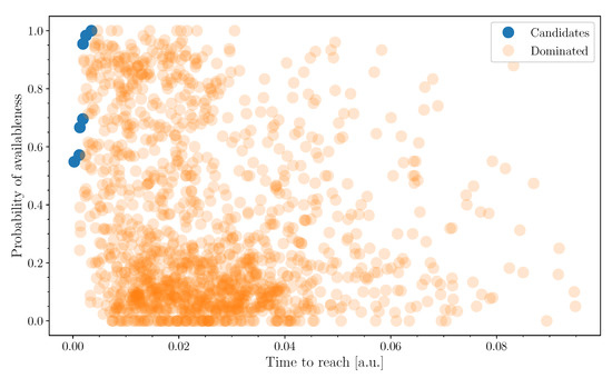 where d is the estimated time to arrive at a given location, x is the user’s location, and, in the right-hand-side, a notation for this domination condition has been introduced. A location in a set , Pareto is optimal if there is no other point dominating it, i.e.,