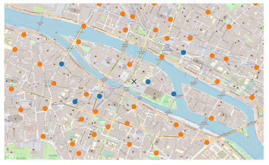 Real-world coordinates of the Pareto optimal points. The location of the user is shown as the black cross. Pareto-optimal choices are shown as blue dots, while sub-optimal locations are shown in orange.