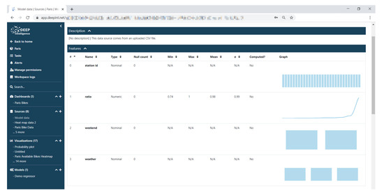 Deepint.net offers multiple functionalities to users for the management of the information contained in data sources (Figure 6). To begin with, the system automatically detects the type of data (Appendix A) and the format (for decimal data or dates), thus, the user does not have to spend time on specifying it. However, in the case of certain graphs or models it may be important to specify the type of data and Deepint.net allows users to specify it manually or change the type that has been detected automatically. It also allows the user to generate features from existing fields using user-defined expressions. At this point in the flow, the creation of derived data sources from existing data sources is possible, as discussed in the previous section. More specifically, different types of operations may be performed on the different data sources, such as filters on records or parameters in a data source, merging two data sources with the same parameters, and much more. The tool also offers the possibility of working with data sources from an API to edit them programmatically.