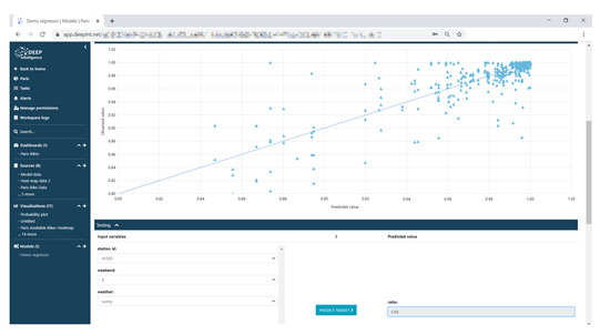 Regressors were built using these data with the assistance of the platform’s online wizard. Figure 19 shows a Random Forest model, including a predicted-observed diagram and an interactive form to invoke the model.