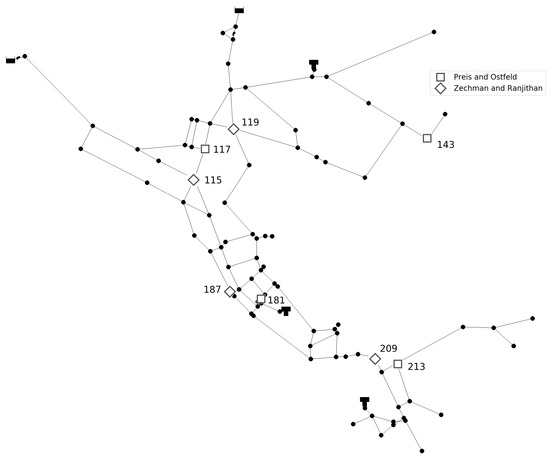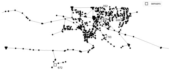 Prediction of the number of injection sources is conducted for two benchmark different sized networks. Investigated networks are Net3 EPANET2 example consisting of 92 nodes and Richmond network consisting of 865 nodes, obtained from The Centre for Water Systems (CWS) at the University of Exeter [24]. For the Net3 network, two different sensor layouts are investigated. In first layout four sensors were placed in network nodes 117, 143, 181, and 213 as in [25] and in second layout four sensor were placed in network nodes 115, 119, 187, and 209 as in [26]. Additionally, an investigation of the number of sensors was conducted. For the first layout, two sensors were placed in network nodes 117 and 181, and for the second layout sensors were placed in network nodes 119 and 209. For Richmond network five sensors were placed in network nodes 93, 352, 428, 600, and 672 where sensor layout was taken from [27]. Layout with three sensors placed in network nodes 93, 428, and 672 was also considered. Considered networks with sensor layouts can be seen in Figure 1 and Figure 2.