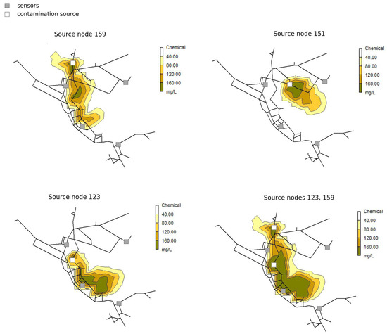 An example of the proposed methodology can be seen for arbitrarily chosen Net3 contamination scenario in Figure 3. Randomly chosen contamination scenario parameters are 3 source nodes (159, 151 and 123), with contamination value of 200 mg/L, starting time 13 h and 20 min and injection duration 2 h. Sensor measurements for chosen contamination scenario can be seen in Figure 4. It can be observed that for source node 151 contamination scenario remains undetected in all sensors placed in the water distribution network, thus for multiple sources scenario only source nodes 123 and 159 are further considered.