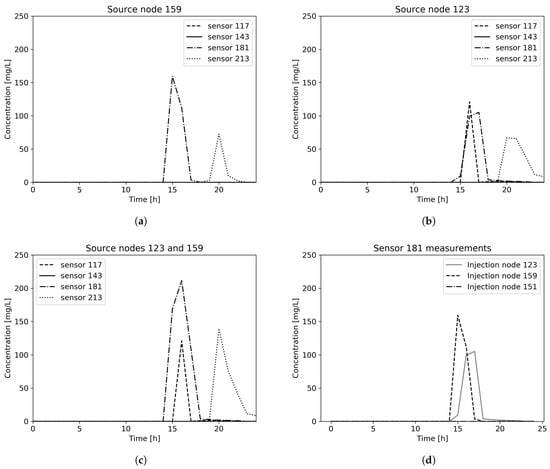 Sensor measurements for Net3 contamination scenario with (a) injection node 159, (b) injection node 123, (c) injection nodes 123 and 159 and (d) contamination measurements in the sensor in node 181.