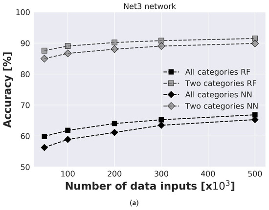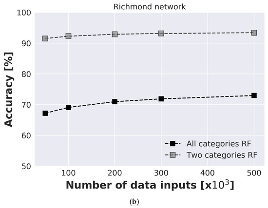 The influence of input data on prediction model accuracy is investigated for both benchmark networks where data ranged from 50,000 to 500,000 inputs (Figure 6). An investigation is conducted for prediction model with 2 categories (model predicts only if single or multiple injection locations are present) and with 4 categories (model predicts an exact number of injection locations). For each model and each number of inputs, 20 runs were conducted to take into consideration the influence of random seed. For the Net3 network second sensor layout with sensors placed in nodes 115, 119, 187, and 209 was considered. For Net 3 results are presented for both RF and NN prediction models. Standard deviation ranged from % for 50,000 to % for 500,000 inputs for NN model, and from % for 50,000 to % for 500,000 inputs. It can be observed that the RF model has slightly better accuracy for all investigated models. Also, due to the faster execution time of the RF model, for all further analyses, only RF results will be presented. For Richmond network, standard deviation ranged from % for 50,000 inputs to % for 500,000 inputs which indicates the stability of the model. Presented results are an average of all 20 runs.