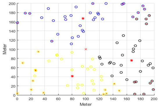 In accordance with the parameters given in Table 3, experimental simulations with three, five, and seven clusters were conducted to obtain the entire network life cycle and the number of surviving nodes. Figure 2 shows the status of dead nodes in the entire network after 2000 rounds of experiments with three clusters. The red multiplication symbol (×) represents the sink position, the red asterisk (*) represents the CH, the solid red dots are the dead nodes, and the remaining hollow dots are the surviving nodes.