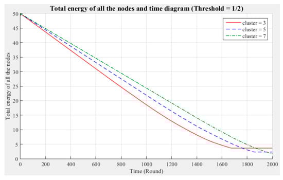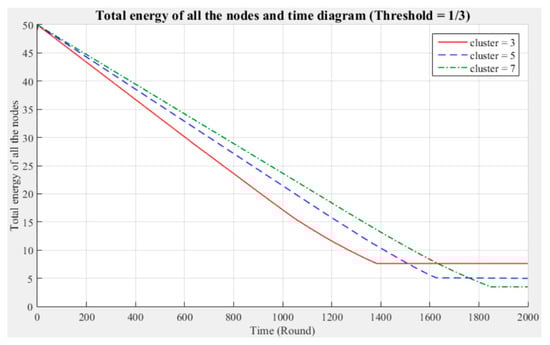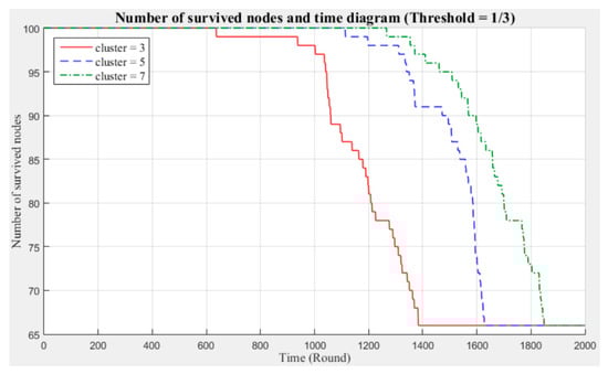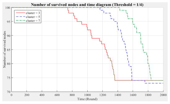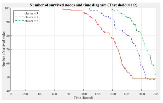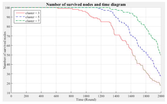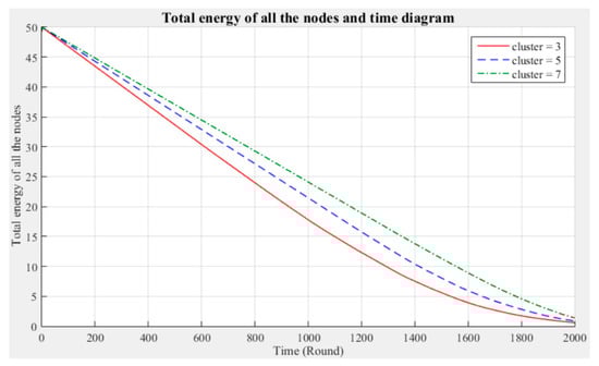 • Changes in the surviving nodes: The number of faulty nodes reaches the fault tolerance value fastest when there are three clusters, which indicates that the nodes in each cluster consume more energy, resulting in a lower node survival rate.