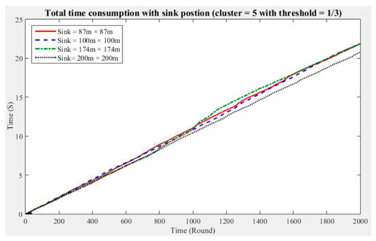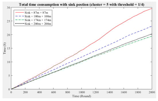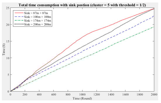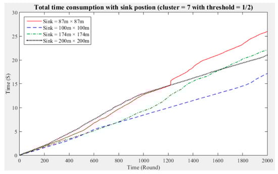 To understand the manner in which different sink deployment positions may affect the time consumed by the entire network to aggregate data, we considered the above experimental results showing the three cluster performance worse than others. Then, we conducted experiments with five and seven clusters while considering different fault tolerance values. The results are presented in Figure 11, Figure 12, Figure 13, Figure 14, Figure 15 and Figure 16, and the time consumption is shown in Table 4.