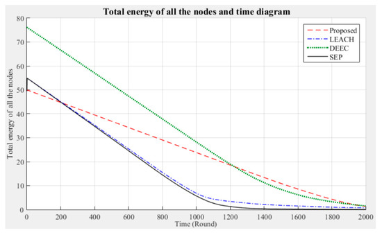 When the sensor network is operated using the LEACH, DEEC, or SEP algorithm, the total energy consumption of the nodes rapidly increases with the number of rounds. In contrast, when the proposed method is used, the total energy consumption tends to be stable. Moreover, from the differences in the number of surviving nodes after 2000 rounds of experiments, as shown in Figure 18, it can be seen that the proposed method can maintain a better node survival rate in the simulated experimental environment.