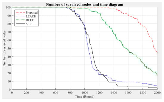 Figure 4. Number of surviving nodes in the network (200 m × 200 m).