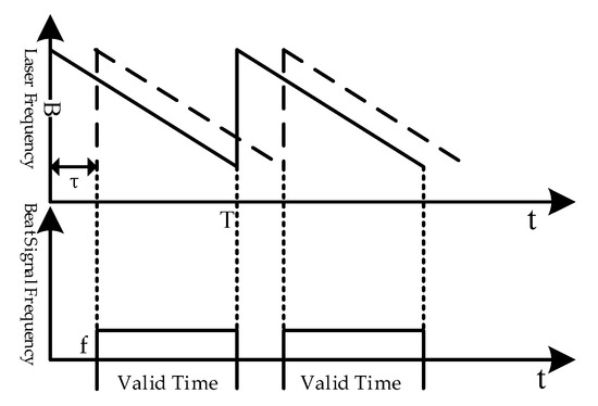 As shown in Figure 1, the solid line represents the instantaneous frequency of the local oscillator laser, and the dashed line represents the frequency of the reflected laser from the target. is the modulation bandwidth (the optical frequency difference corresponding to the start and end wavelengths of the laser), is the modulation period, and is the time delay between the two lasers. Beat signals are obtained coherently by the two lasers on a detector, and the frequency of the beat signal is .