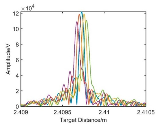 Figure 4 shows the dispersion compensation results with five different modulation coefficients where the modulation coefficients of the first and fifth distance spectra are symmetric with that of the third one whose modulation coefficient is , and it is the same for the second and fourth distance spectra. The evolution of the peak variation distortion elimination method takes the peak amplitude of the target distance spectrum as the judgment criterion to determine the optimal signal modulation coefficient. The closer the modulation coefficient is to , the higher the distance spectrum amplitude. In the third distance spectrum, the broadening and offset caused by dispersion mismatch is eliminated. Simulation results verify the effectiveness of the dispersion compensation method based on the resampling of the modulated signal.