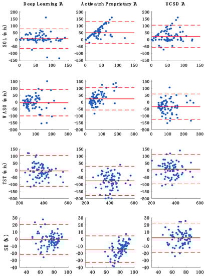 Table 3 lists the overall mean and standard deviation of the sleep parameters assessed by PSG as well as by Actiwatch with data analyzed, respectively, by its proprietary IA, UCSD IA, and proposed HA. Mean sleep onset latency (SOL) varied from ~10 min by the Actiwatch proprietary IA to ~54 min by the proposed deep learning HA, while the reference PSG was ~61 min. WASO varied from ~59 min by the Actiwatch proprietary IA to ~116 min by the UCSD IA, while the reference PSG was ~83-min. Total sleep time (TST) ranged from ~359 min by the UCSD IA to ~442 min by the Actiwatch proprietary IA, while the reference PSG was ~368 min. Finally, sleep efficiency (SE) varied from ~71% by the UCSD IA to ~87% by the Actiwatch proprietary IA, while the reference PSG was ~73%. Overall, estimation of the sleep parameters by the HA deep learning method displayed greatest similarity to PSG; in contrast, average values derived by the Actiwatch proprietary IA were most divergent from PSG values.
