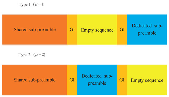 where and represent the shared sub-preamble and dedicated sub-preamble respectively, denotes Guard Interval (GI), denotes an empty sequence with length . Besides, denotes the length of the sub-preambles, denotes the length of the GI and represents the transmission power. The preamble sequence generation scheme is summarized as Algorithm 1.