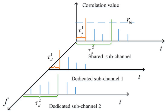 After the gNB detects the received shared sub-preambles, a set of TA values can be captured, where denotes the number of detected shared sub-preambles. Similarly, another set of TA values can be obtained, where represents the number of detected dedicated sub-preambles. For ease of description, in the subsequence, the TA values in set are defined as shared TA values and those in set are defined as dedicated TA values. If , the corresponding shared sub-preamble and dedicated sub-preamble are considered to belong to the same devices. This is because the shared sub-preamble and dedicated sub-preamble that sent by the same device always suffer from the same channel delay. Consequently, the gNB can identify preambles sent from different devices through comparing the shared TA value and the dedicated TA value.