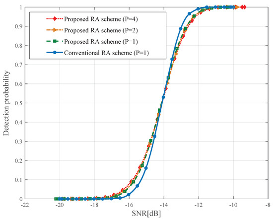 To evaluate the impact of sub-preambles on the preamble detection probability, the proposed RA scheme is compared with conventional RA scheme when total P devices select exclusive sub-preambles to access to a gNB on the same PRACH. The preamble detection performance of the proposed RA scheme may be degraded, since the length of designed preambles is shorter than the conventional ones. To test the negative effect of sub-preambles, we randomly select sub-preamble sequence with different indexes from the available sub-preamble set.