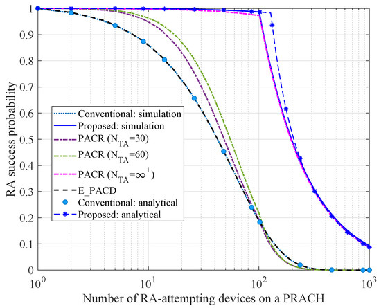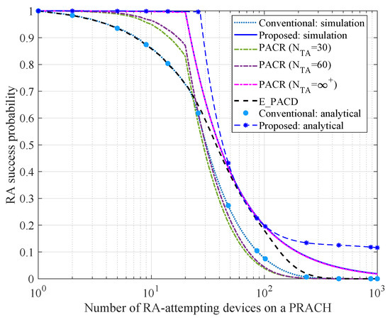 where represents the RA success probability in conventional scheme. Typically, the RA success probability in the conventional scheme is defined as the probability that a device uses an exclusive preamble and is allocated an exclusive PUSCH resource. Besides, represents the probability that the PUSCH resources are wasted. Moreover, the RA failure probability in conventional scheme is equal to . Consequently, the RA success probability under conventional scheme can be expressed as