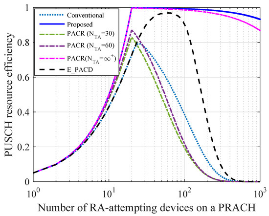 where denotes the number of PUSCH resources which are allocated to collision-free devices. As shown in Figure 8, the resource efficiency under the proposed scheme is higher than that under other schemes, especially when the amount of RA-attempting devices on the same PRACH is large. When , the resource efficiency under the proposed scheme and that under PACR scheme both decrease with . This is because the PUSCH resources are not enough to be allocated to the collision-free devices when . However, the proposed scheme can still guarantee a high resource efficiency even though is large.
