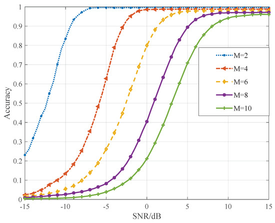 As depicted in Figure 9, the number of preambles sent on the same PRACH is set to . It is observed that better TA capturing performance can be guaranteed when less devices transmit identical preamble on the same PRACH. For the case of , the proposed scheme can guarantee over accuracy even though the SNR is low (i.e., −10 dB). Similar accuracy can be obtained when SNR reaches 6 dB for the case of where interference is severe. Please note that the probability that 10 devices select the same shared sub-preamble is quite low. According to Equation (12), the probability is only when 1000 devices request RAs with 60 available preambles.