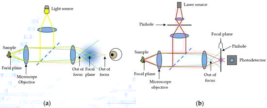 Comparison between (a) conventional optical microscopy and (b) confocal laser scanning microscopy.