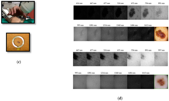 Delpueyo et al. [28] (Figure 2) proposed an LEDs-based MS imaging system with eight different wavelengths (414 to 995 nm). Using the spatial distribution of color and spectral features, they allowed an improvement in the detection of skin cancer lesions, specifically melanomas and BCCs.