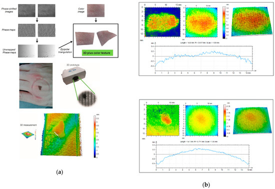 Ares et al. [64] developed a 3D scanner that incorporates two megapixel stereoscopic cameras, which are placed at a certain distance from each other and oriented at a specific angle. In the middle, they placed a picoprojector (Figure 3). It also incorporated a color camera to take a conventional RGB image of the lesions. Rey-Barroso et al. [65] used the same 3D imaging scanner to obtain morphological parameters of skin lesions related to the perimeter, area, and volume with micrometric precision and found significant differences between melanoma and nevus.