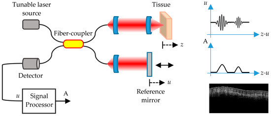 Schematic representation of an SS-OCT imaging system. u is the reference signal and A is the interference signal that produces the image of the different layers of the skin.