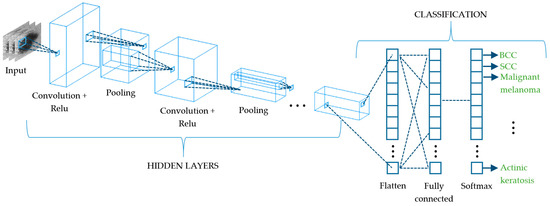Skin cancer is the uncontrolled growth of abnormal skin cells that occurs when unrepaired deoxyribonucleic acid (DNA) genetic defects lead them to multiply and form malignant tumors [1]. The great majority of skin cancer etiologies usually are classified into two large groups: melanoma and non-melanoma skin cancers. Melanoma represents 4% of skin cancer lesions and is the most aggressive and lethal of all forms [2]. It originates from the melanocytes, the pigment-making cells of the skin, and it is more likely to grow and spread if left undertreated; hence, its early diagnosis and treatment is crucial for dermatologists. For this reason, work-related authors have given priority to the detection of melanoma. Apart from the carcinogenic form, melanocytes can also form benign growths called moles [3]. On the other hand, the non-melanoma group includes Basal Cell Carcinoma (BCC), which is the most common type (about eight out of 10 of the skin cancers), and Squamous Cell Carcinoma (SCC), which is the second most common form (about two out of 10). These cancers are most often found in body areas exposed to the sun, such as the head, neck, and arms, but they may appear elsewhere. BCCs tend to grow slowly and it is unusual that they spread to other parts of the body; however, if left untreated, they can invade the surrounding areas. Regarding SCCs, they are more likely to grow into deeper layers of skin and spread to other parts of the body, although this is uncommon [3].