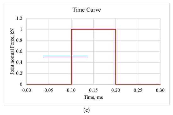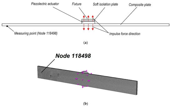 In this section, the analytical research and simulation results of the defect determination in the composite material are presented. By using the SolidWorks 2019 nonlinear simulation software, a computational finite-element model of the composite plate was created. Composite plate, in which its properties and geometric characteristics are presented in Table 1, was excited with impulse force (parameters presented in Figure 4c), added on opposite sides of a piezoelectric transducer (actuator) (Figure 4a), and its displacement response was measured at nodal point no. 118498. Notice, that both excitation and measuring points correspond to the centers of excitation and measuring transducers, respectively, used in experimental research. Contact between all parts—composite plate, piezoelectric actuator, and soft isolation layer was set as bonded. All this structure was fixed on the soft isolating material layer’s (parameters presented in Table 1) face, as it was done in experimental research. Schematic representation of boundary conditions is presented in Figure 4a. The application of piezoelectric sensors in damages or different type of defect detection was used by other authors [20,21,31]; as for a structural health monitoring (SHM) system, this method is of great significance [32].