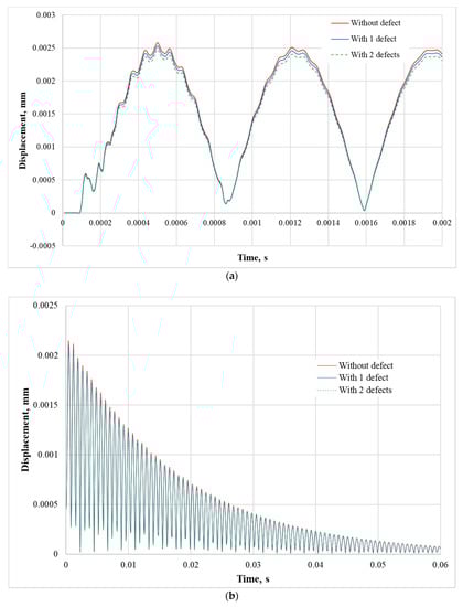 Displacement response of the composite plate displacement response (of nodal point no. 118498) which consists of 119280 nodal points to the impact force; red, blue and green curves present the composite plate without defect, with one defect and with two defects, respectively: (a) Simulation time of 0.002 s; (b) Simulation time of 0.06 s.