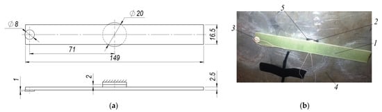 Properties of the investigated composite plate are given in Table 1. The geometrical dimensions of the composite plate and view of the diagnostic system are presented in Figure 6, Figure 7, Figure 8 and Figure 9. For every one experimental phase (i)–(iii), two types of experimental tests were performed: