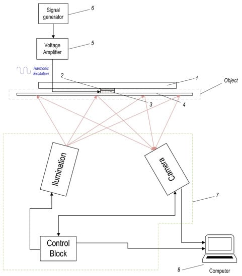 Scheme of holographic experimental set-up: 1—aluminum base (perpendicular to illumination and camera), 2—soft isolation layer, 3—piezoelectric transducer–actuator (for excitation), 4—composite plate, 5—voltage amplifier EPA 104, 6—signal generator Tabor WW5064, 7—holographic system PRISM, 8–PC.