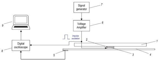 Scheme of experimental set-up during the mechanical impact force investigations: 1—aluminum base, 2—soft isolation layer, 3—piezoelectric transducer–actuator (for excitation), 4—composite plate, 5—piezoelectric transducer–sensor, 6—voltage amplifier EPA 104, 7—signal generator Agilent 33220A, 8—digital oscilloscope PicoScope 6407, 9–PC.
