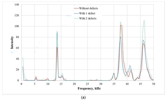 Figure 4b shows the finite-element numerical model with boundary conditions. This model consists of 76,754 finite elements with 119,280 nodal points when the plate has two defects. The calculations’ impulse excitation time was equal to 0.1 ms. The calculations were carried out in three cases: