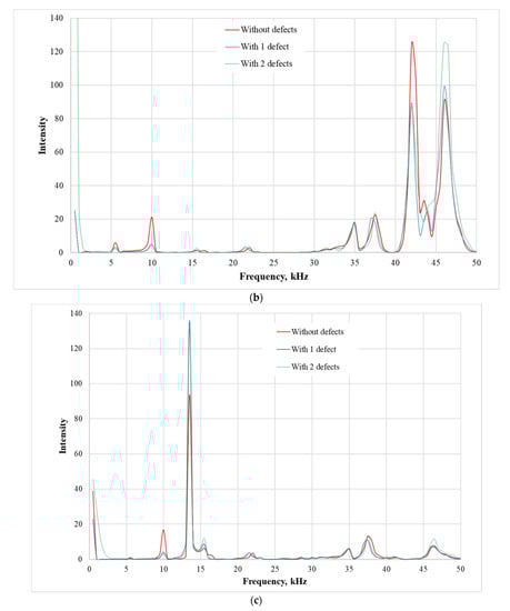 The spectrograms of the composite plate responses to the mechanical impact input show that the composite material plate without defect and the composite material plate with a defect give different forms of the signals according to the frequency and amplitude of the resonances. These differences in the signals are essential to the identification of the defect in the composite plate. The excitation frequency higher than 50 kHz is not informative at all due to environmental noise. Therefore, the spectrograms are analyzed in the frequency range from 1 Hz to 50 kHz. The highest response amplitudes are observed at the given impulse force-time durations of 9.5 × 10−5 s, 7.7 × 10−5 s and 2.4 × 10−5 s, respectively. Moreover, the most accurate results which indicate the composite material conditions are obtained at the frequency of 5.5 kHz, 10 kHz, 13 kHz, 37.5 kHz, 42.5 kHz and 47 kHz. These maximal values of the amplitudes (pk-to-pk) depend on the impact force duration time. In particular, in the spectrograms, the red curve represented the oscillation intensity of the composite material plate without defects; the blue one—with one defect and the green one with two defects. In the presented spectrograms, at the certain vibration frequencies of the composite plate (5.5 kHz, 10 kHz and 47 kHz), different vibration amplitudes are obtained. At the frequency of 5 kHz and 8 kHz, the vibration amplitude of the composite plate with no defect (red curve) is the highest, the vibration amplitude of the composite plate with one defect (blue curve) is decreased by 5% and the vibration amplitude of the composite plate with two defects (green curve) is decreased by 70%. At the frequency of 47 kHz, these results are opposite.