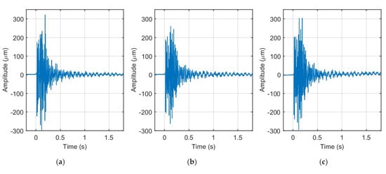 Spectrograms of the composite plate responses to the impact force for the impulse duration time of: (a) 9.5 × 10−5 s; (b) 7.7 × 10−5 s; and (c) 2.4 × 10−5 s, respectively.