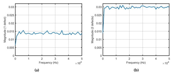 Frequency response functions (FRFs): (a) One defect; (b) Two defects.